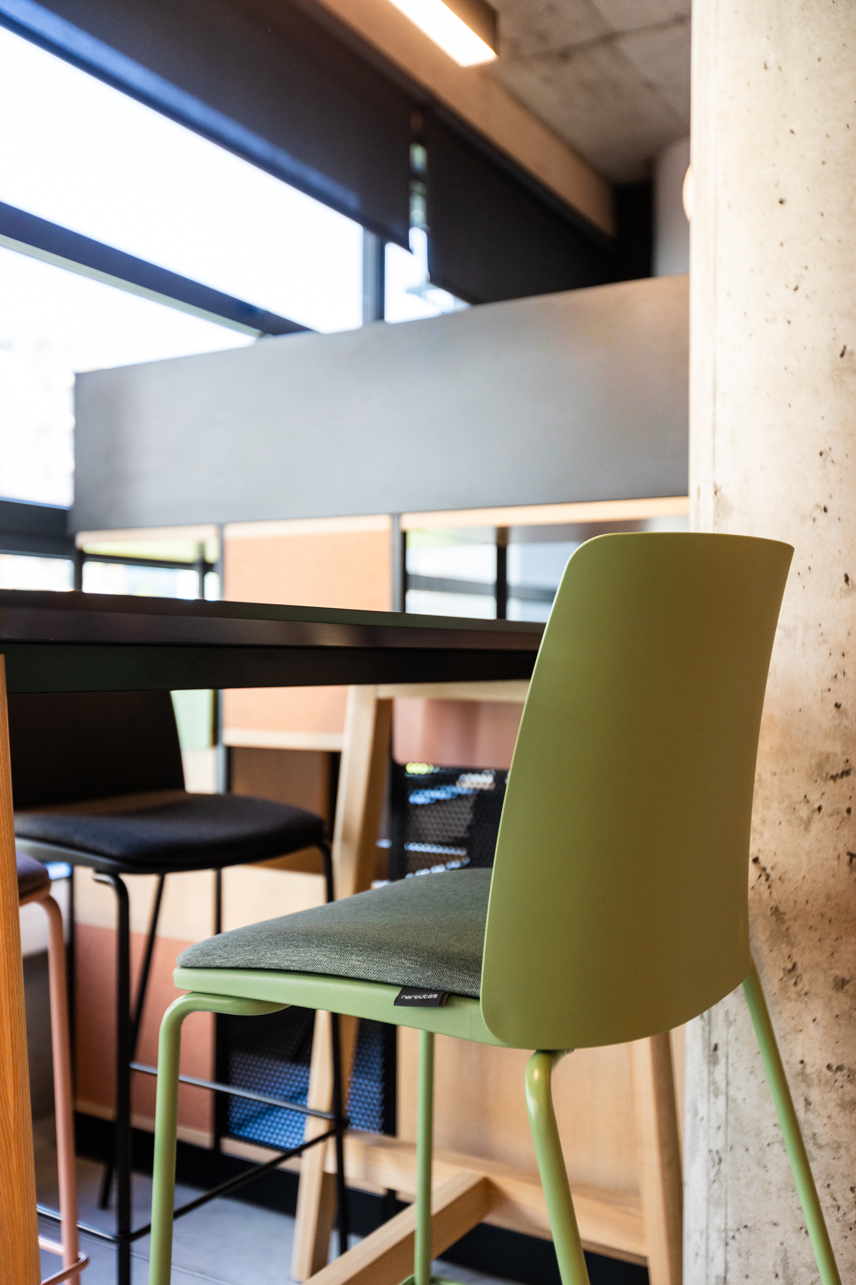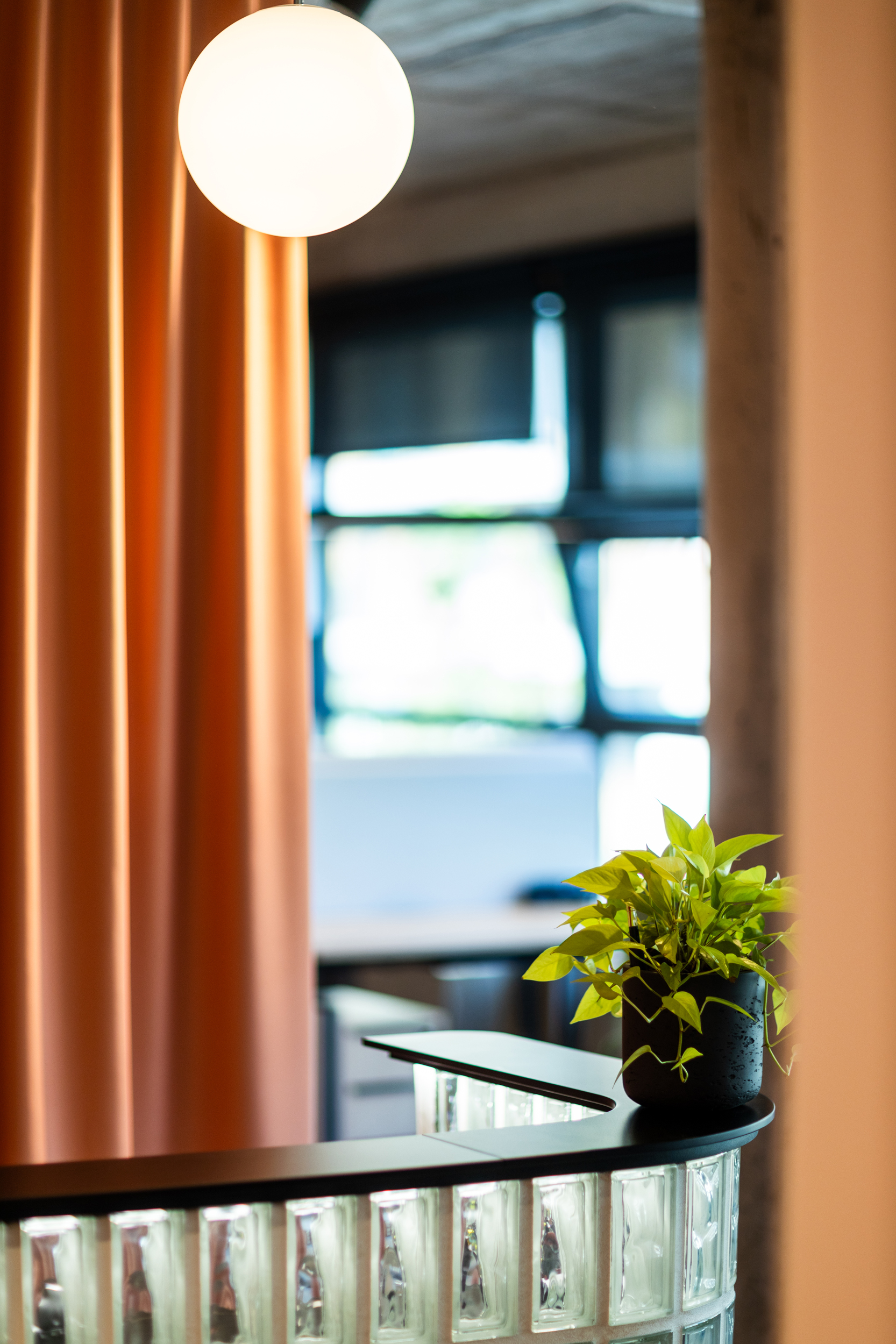 Round corners, flexible curtains, sound system or furniture solutions in this office space were designed with an emphasis on supporting innovation and creativity. The industrial design, combined with the warm color of the curtains, creates a dynamic and inspiring environment. Open spaces and multifunctional zones allow employees flexibility and encourage collaboration, which is key to innovative thinking. The use of natural materials such as wooden cabinets and plants that enliven the space contributes to an ecological and healthy workplace. The presence of plants not only improves air quality, but also supports the mental well-being and productivity of employees. The acoustic lining in the meeting room is made of recycled material. The glass blocks used in the reception desk are recyclable and sustainable, minimizing the ecological footprint.